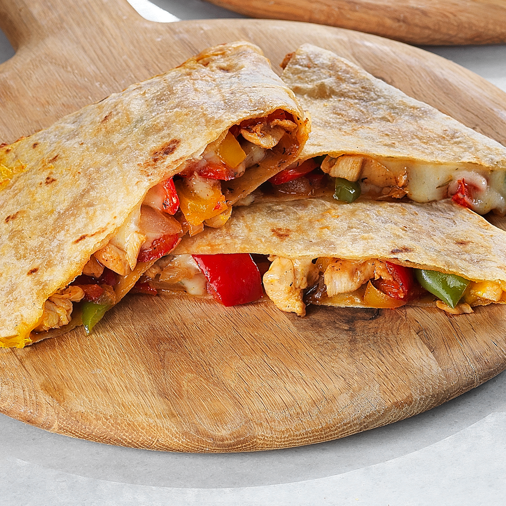 Tortilla ekmeğinde tavuk bonfile, soğan, biber, cheddar ve kaşar peyniri ile hazırlanır